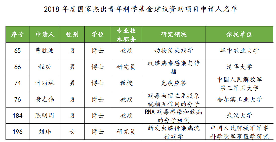 近日國家自然科學(xué)基金委員會正式公布了國家自然科學(xué)基金委員會關(guān)于公布2018年度國家杰出青年科學(xué)基金建議資助項目申請人名單的通告,2018年國家杰青正式出爐。和往年一樣,今年建議資助的國家杰青共有200人,來自112家單位的科學(xué)家入選。作為和長江學(xué)者一樣備受關(guān)注的高端人才,每年的杰青牽動著無數(shù)人的心,而今年的結(jié)果也必然又是幾家歡樂幾家愁。6位病毒學(xué)相關(guān)領(lǐng)域大咖獲2018年度國家杰出青年基金資助。