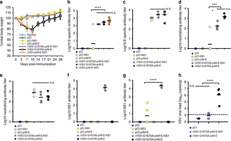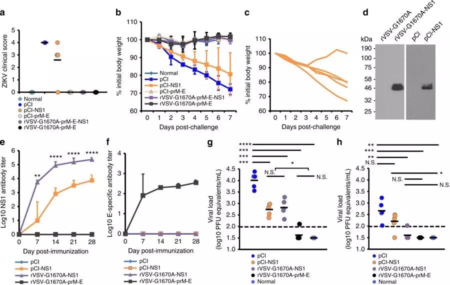 5. 為了進一步評估疫苗的免疫保護效果,作者以質(zhì)粒DNA疫苗pCI-prM-E、pCI-NS1為對照,對突變載體疫苗VSV-G1670A-prM-E-NS1、rVSV-G1670A-prM-E、rVSV-prM-E-NS1在I型干擾素缺失的A129小鼠中進行評估。單針免疫105PFU的重組病毒疫苗,并以106的寨卡病毒柬埔寨株(FSS13025)進行攻擊。結(jié)果發(fā)現(xiàn),基于mtdvv的疫苗在A129小鼠中可誘導(dǎo)ZIKV特異性體液免疫反應(yīng),并提供完全的保護(Fig5,7)。此外,對單獨NS1在免疫反應(yīng)和免疫保護中的作用探討結(jié)果表明,雖然NS1不能誘導(dǎo)中和抗體,但能夠?qū)π∈蟮腪IKV感染提供部分保護(Fig6,7)。對rVSV-prM-E-NS1 在 A129小鼠中免疫保護效果研究表明,該疫苗不僅具有良好的減毒性,還能完全保護小鼠免受ZIKV的攻擊(Fig8)。