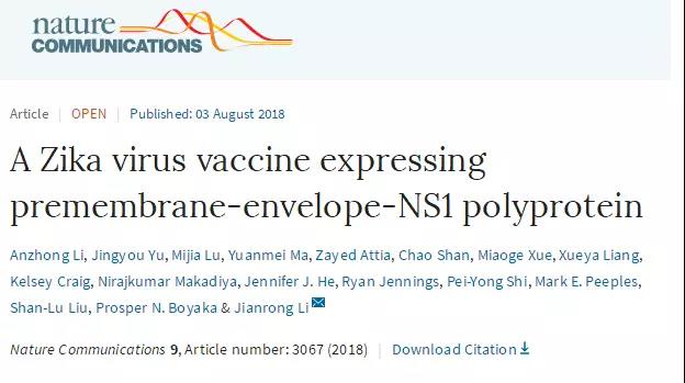1. LiA, Yu J, Lu M, Ma Y, Attia Z, Shan C, Xue M, Liang X, Craig K, Makadiya N, HeJJ, Jennings R, Shi PY, Peeples ME, Liu SL, Boyaka PN, Li J. AZika virus vaccine expressing premembrane-envelope-NS1 polyprotein. NatCommun. 2018 Aug 3;9(1):3067.