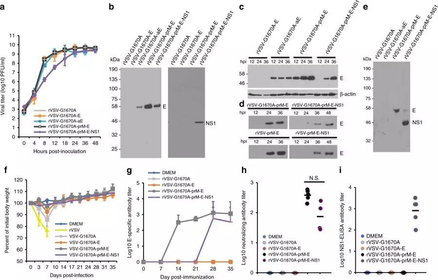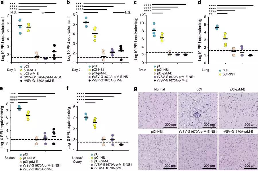 2.為了進一步提高疫苗的安全性,研究者對rVZV進行了定點突變的減毒改造,并對獲得減毒后的重組載體病毒疫苗rVSV-G1670A-E, rVSV-G1670A-E, rVSV-G1670A-prM-E和rVSV-G1670A-prM-E-NS1與野生型病毒rVZV和母本病毒rVSV-G1670A進行了比較。結(jié)果表明,基于突變載體MTase-defective rVSV (mtdVSV)的疫苗具有高度的減毒性和良好的免疫原性(Fig2)。