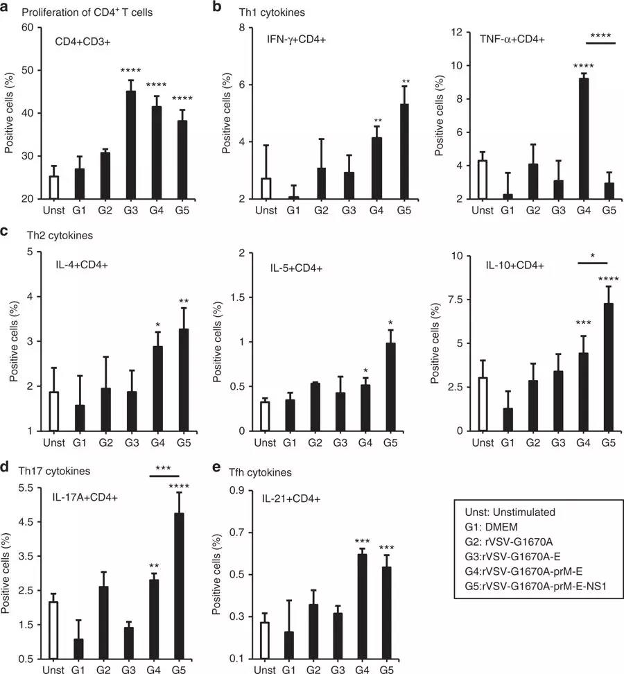 3.進一步的細(xì)胞免疫檢測結(jié)果發(fā)現(xiàn),共表達NS1的重組mtdVSV在BALB/c 小鼠中可誘發(fā)ZIKV特異性T細(xì)胞免疫反應(yīng)。prM、E、NS1共表達誘導(dǎo)的Th2和Th17細(xì)胞因子反應(yīng)與prM-E相比水平顯著升高(Fig 3)。