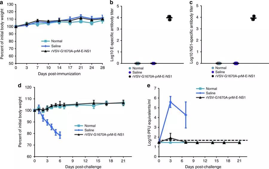 近日,美國俄亥俄州立大學(xué)大學(xué)、德克薩斯州立大學(xué)等科學(xué)家聯(lián)合攻關(guān),以減毒重組水皰性口炎病毒(rVSV)為載體,研發(fā)了一種表達ZIKV prM-E-NS1多蛋白的病毒載體疫苗,單針免疫便可誘導(dǎo)小鼠產(chǎn)生ZIKV特異性體液和細(xì)胞免疫應(yīng)答,并能有效對抗ZIKV的攻擊。相關(guān)研究以“A Zika virus vaccine expressingpremembrane-envelope-NS1 polyprotein.”為題,發(fā)表于2018年8月3日最新一期的國際期刊Nature Communication。