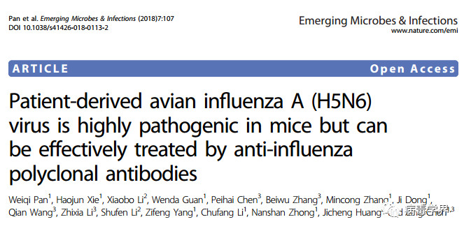 1. .Pan W, Xie H1, Li X, Guan W, Chen P,Zhang B, Zhang M1, Dong J, Wang Q, Li Z, Li S, Yang Z, Li C, Zhong N, Huang J,Chen L Patient-derived avian influenzaA (H5N6) virus is highly pathogenic in mice but can be effectively treated byanti-influenza polyclonal antibodies. Emerg Microbes Infect. 2018 Jun13;7(1):107.