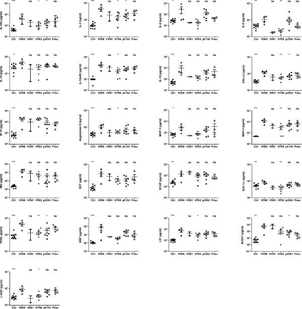 研究首先系統(tǒng)分析了19例H5N6感染病例的臨床特征。結(jié)果發(fā)現(xiàn),與H5N1和H7N9病毒感染相比較,H5N6病毒感染病例具有更高頻率淋巴細胞減少及較高的丙氨酸轉(zhuǎn)氨酶(ALT)和乳酸脫氫酶(LDH)水平。通過對血清中48種細胞因子/趨化因子的檢測,發(fā)現(xiàn)H5N6病毒感染呈現(xiàn)顯著的“細胞因子風(fēng)暴”特征,血清中多種因子的水平顯著高于H7N9、H5N1和pH1N1病毒感染病例及細菌性肺炎病例,包括IL-2Rα、IL-12p40、IL-18、IFN α2、IP-10等。進一步對兩例死亡病例和一例康復(fù)病例血清中細胞因子的動態(tài)變化進行了檢測,發(fā)現(xiàn)康復(fù)病例血清中細胞因子水平在感染后快速下降,而兩例死亡病例細胞因子持續(xù)處于高水平狀態(tài),提示持續(xù)高水平的細胞因子可能是造成H5N6病毒感染死亡的重要原因之一。