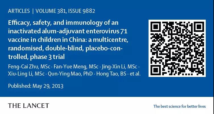 8. Zhu FC, Meng FY, Li JX, et al. Efficacy, safety, and immunology of an inactivated alum-adjuvant enterovirus 71 vaccine in children in China: a multicentre, randomised, double-blind, placebo-controlled, phase 3 trial. Lancet 2013; 381: 2024-32.