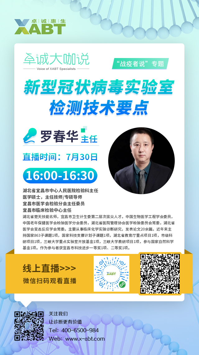 卓誠(chéng)大咖說(shuō)之“戰(zhàn)疫者說(shuō)”專題第四期將于7月30日16:00正式開(kāi)播,我們非常榮幸邀請(qǐng)到湖北省宜昌市中心人民醫(yī)院檢驗(yàn)科羅春華主任為我們帶來(lái)《新型冠狀病毒實(shí)驗(yàn)室檢測(cè)技術(shù)要點(diǎn)》的主題講座,期待各位屆時(shí)蒞臨直播間,共同學(xué)習(xí),互相啟發(fā)!
