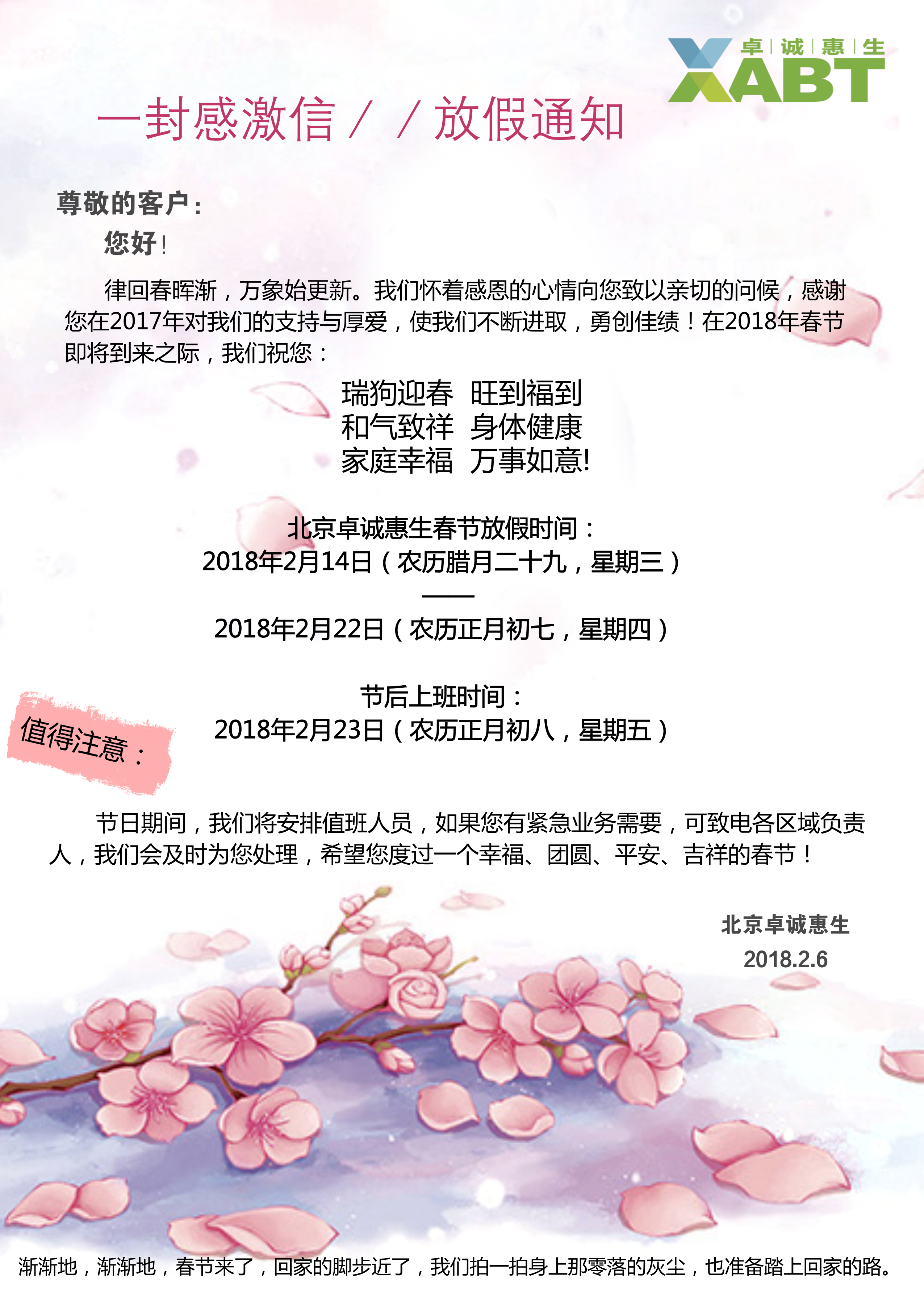 北京卓誠惠生2018年春節(jié)放假通知